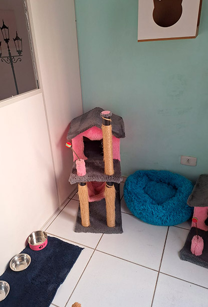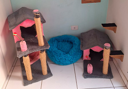 Na Suíte Pierre, os detalhes fazem a diferença: caminha aconchegante, arranhador robusto, nichos elevados e brinquedos envolventes criam um ambiente ideal para gatos curiosos e ativos explorarem com segurança.
